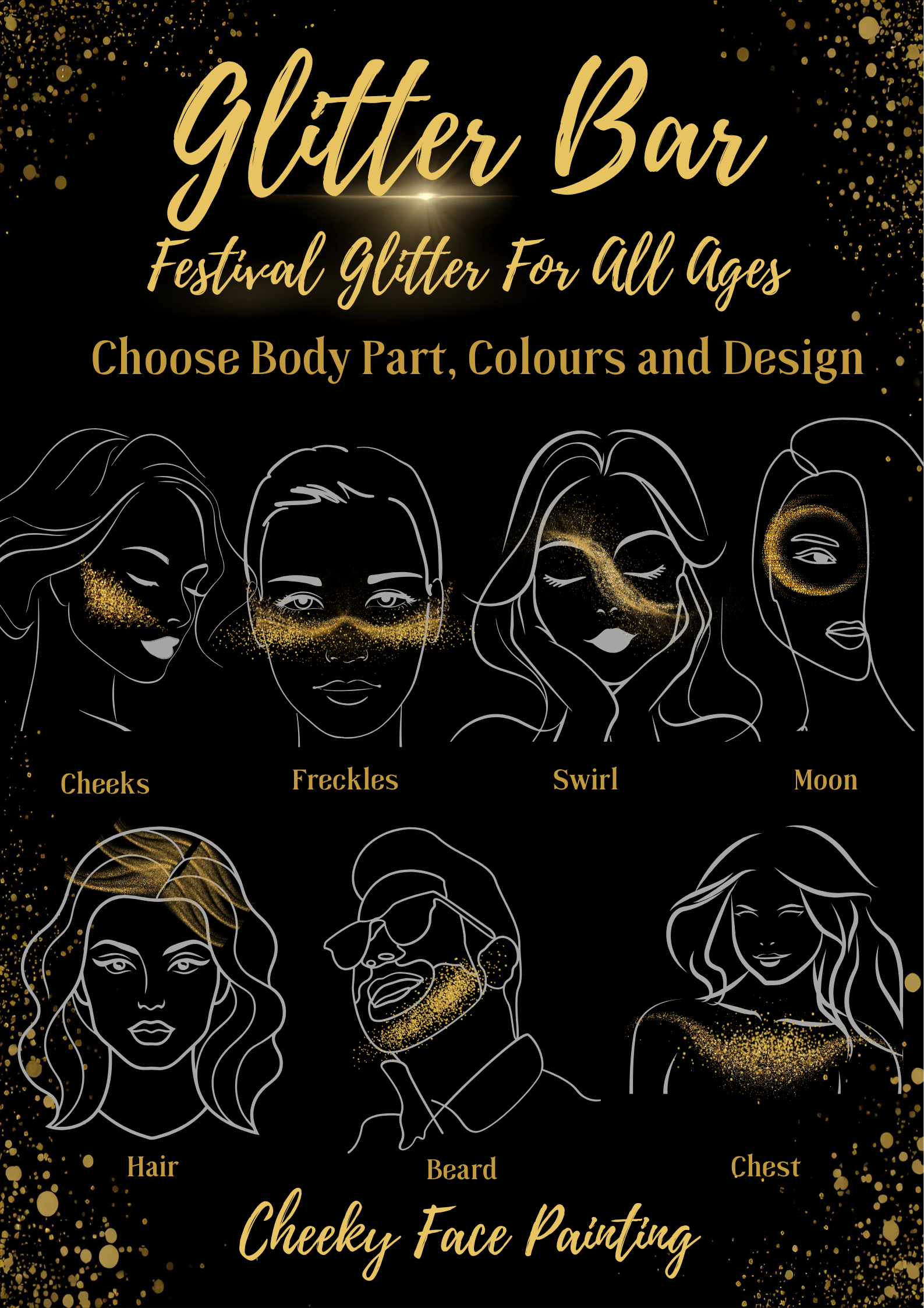 The Glitter Bar—a dazzling festival-style experience that adds extra sparkle to your event. Guests can enjoy shimmering festival glitter looks, sparkling cheek designs, and bold glitter accents that are perfect for parties, weddings, and charity fairs. It’s a fun, inclusive way to make everyone feel fabulous.